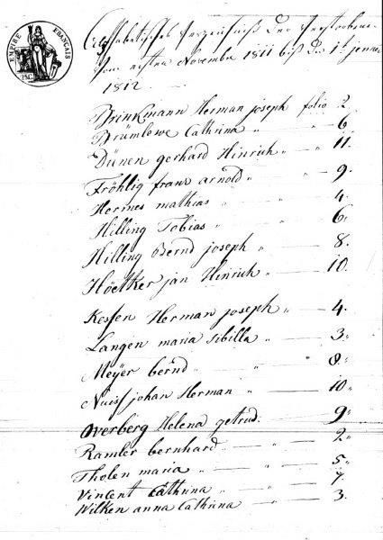 Alfabetisches Verzeichniß der Verstorbenen vom 01.11.1811 bis den 01.01.1812 Brinkmann Hermann Joseph folio 2 Brümlewe, Cathrina folio 6 Dünen, Gerhard Henrich folio 11 Fröhlig, Frans Arnold folio 9 Hermes, Mathias folio 4 Hilling, Tobias folio 6 Hilling Bernd Joseph folio 8 Höetker, Jan Hinrich folio 10 Kessen, Herman Joseph folio 4 Langen, Maria Sibilla folio 3 Meyer, Bernd folio 8 Nuiss, Johan Herman folio 10 Overberg, Helena Getrud folio 9 Ramler, Bernhard folio 2 Tholen, Maria folio 5 Vincent, Cathrina folio 7 Wilken, Anna Cathrina folio 3 [Bild 3] Wolken eine immediat nach der Geburth verstorbene Tochter von Gerhard Wolken und Cathrina Magretha Benen folio 7 Wiegmann, Gerd Herm folio 11 Weers, Anna Helena folio 5 Haselünne, 31 December 1811 Der Maire Többen [Bild 2] Erstes Blatt Brockhausen provis. President Departement der Ober-Ems Arrondissement von Lingen Mairie von Haselünne 1811 Gegenwärtiges Register der Sterbe-Acten der Mairie von Haselünne für das Jahr achtzehnhundert und eilf, enthaltend sechs zehn Blätter, ist von uns unterschriebenen Präsidenten des Tribunals erster Instanz zu Lingen in Gefolg des 41ten Artikels des Codes-Napoleon, paraphirt worden. Geschehen zu Lingen den zehnten October Eintausend-achthundert eilf. Brockausen [Bild 3] [Nr. 1, Tod von Jugendlicher Herman Joseph Brinkmann, Berßen] Heute den 2. Tag des Monats November im Jahre 1811 erschienen vor mir Maire, Beamter des Civilstands der Gemeinde Haselünne im Departement Ober-Ems im Canton und Municipalitet Haselünne der Jan Knolle, Nachbar und Ferdinand Brinkman, Bruder des verstorbenen und haben uns erklärt, daß am 01.11 des morgens 2 Uhr der Herman Joseph Brinkman in Bersen [Berssen] wegen Jugens nach ohne Gewerbe und unverheyrathet, Sohn von Detert Brinkman und Margreta Dirkes gestorben ist, und haben die Erklährenden, nachdem ihnen diese vorgelesen, es zugleich mit uns unterschrieben. Der Maire Többen Ferind Brinkman ++ Johan Knoll Zeichnet diese beyden Kreuze, weil er nicht schreiben kann Der Maire Többen [ohne Altersangabe!] [Nr. 2, Tod von Kind Bernhard Rammler, Haselünne] Heute den 4. Tag des Monats November im Jahre 1811 erschienen vor mir Maire Beamten des Civilstands der Gemeinde Haselünne, Departement Ober-Ems im Canton und Municipalitet Haselünne Ferdinand Brakel und Gerhard Wilmereing, Nachbarn und haben uns erklärt, daß am 03. des Monats November nachmittags 4 Uhr der Bernd Ramler, alt 7 Jahre, Sohn von Fridrich Ramler und Gesina Wübbels in dem Hause No 96 in der Hasestraße gestorben ist, und haben die Erklärenden, nachdem ihnen dieses vorgelesen worden, solches mit uns unterschrieben. Ferdinand Brakel Gerhart Wilmerering Der Maire Többen [Nr. 3, Tod von Maria Sibilla Niemann, geb. Langen, Haselünne] Heute den 06. Tag des Monats November im Jahre 1811 erschienen vor uns Maire Beamter des Civilstands der Gemeinde Haselünne, Departement der Ober-Ems, Canton und Municipalitet Haselünne Fridrich Ottens, und Joseph Kock, Nachbarn, und haben uns erklärt, daß den 05. des Monats November um 6 Uhr morgens Maria Sibilla Langen, Ehefrau Rudolph Nieman Apotheker, 75 Jahr alt im Hause No. 109 in der Hasestraße zu Haselünne gestorben ist, und haben die Erklärend, nachdem ihre dieses vorgelesen worden, zugleich mit uns unterschrieben. Der Maire Többen Friderich Ottens Joseph Kock [Bild 5] [Nr. 4, Tod von Kind Maria Catharina Wilkens, Eltern] Heute den 13. Tag des Monats November im Jahre 1811 erschienen vor mir Maire Beamter des Civilstands der Gemeinde Haselünne, Departement der Ober-Ems im Canton und Municipalitet Haselünne Tobias Witte und Gerhard Hinrich Brümmer, Nachbahren, und haben erklährt, das am 11. dieses morgens 12 Uhr Maria Catharina Wilkens, Tochter von Gerhard Hinrich Wilken und Anna Catharina Ippen, Ehefrau Wilken in ihrem Hause in Eltern 10 Tage alt gestorben ist, und haben dies erklährende, nachdem ihnen diese vorgelesen, mit uns unterschrieben. ++ Tobias Witte ist des Schreibens unkundig, der Maire Többen ++ Gerhard Hinr. Brummer kann nicht schreiben der Maire Többen [Nr. 5, Tod von Kind Mathias Hermes, Westerloh] Heut den 14. Tag Monats November des Jahrs 1811 erschienen vor uns Maire Adjoint Deluegirten Beamten des Civil Standes der Gemeinde Haselünne, Departement der Ober-Ems im Canton und Municipalität Haselünne Theodor Rensen und Theodor Eilers aus Westerlohe, Nachbarn, und haben uns erkläret, daß den 12. des Monats November um 9 Uhr abends Mathias Hermes, alt 9 Tage im Hause Jann Herm Busken, ohne Nummer zu Westerlohe gestorben ist, und haben die Erklärenden, nachdem ihnen dieses vorgelesen worden es zugleich mit uns unterschrieben. Brinkmann Maire Adjoint Theodor Rensen Theodor Eilers [Bild 6] [Nr. 6, Tod von Kind Hermann Joseph Kerssen, Berßen] Heute den 16. Tag des Monats November im Jahre 1811, vor uns Maire Beamter des Civilstands der Gemeinde Haselünne, Departement der Ober-Ems, Canton und Municipalität Haselünne erschienen der Joseph Meiners und Ferdinand Knoll, Nachbahrn und haben uns erklährt, daß am 15. Tage dieses Monaths November um 12 Uhr Mittag der Herman Joseph Kerssen, alt 8 Monath, Sohn von Bernd Henrich Kerssen, Ackerman in Berssen und Helena Geers Ehefrau Kerssen in Berssen gestorben ist, haben die Erklährend[en] nachdem ihnen dieses vorgelesen worden es zugleich mit uns unterschrieben. Der Maire Többen Josep Meyners Ferdinand Knol ist des Schreibens unkundig, der Maire Többen Der Maire Többen [Nr. 7, Tod von Anna Helena Berentzen, geb. Wehers, Lotten] Heute den 20. Tag des Monaths November im Jahr 1811 vor uns Maire Beamten des Civil Standes der Gemeinde Haselünne, Departement der Ober-Ems im Canton und Municipalität Haselünne erschienen Jann Dirk Klene, Ackkermann alt 41 Jahre und Herm Bernd Berentzen alt 29 Jahre, Nachbarn und haben uns erklärt, daß am 18.11 nachmittags 4 Uhr Anna Helena Wehers, 75 Jahr alt, Ehefrau des Jann Bernd Berntzen, Ackkermann aus Lotten gestorben sey, und haben die Erkl