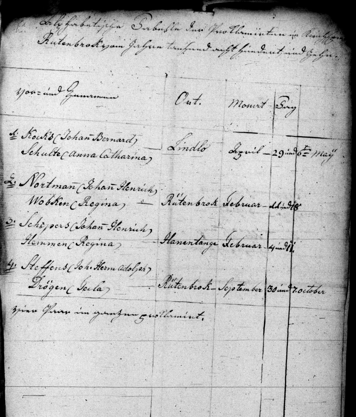 Erstes Blatt Brockhausen Prasident Rütenbrok am 18.02.1810 des Morgens um 9 Uhr. Der 32 Jahre, 8 Monate und 26 Tage alte Junggeselle, und Ackerbaus-Gehülfe Johann Henrich Schepers aus Kleinen Hesepe, Kirchspiels Hesepe, des dortigen verstorbenen Brinksitzers Gerhard Hinrich Schepers, und dessen Ehefrau Penenna Maria Schepers geborne Stubbe, drittgeborner ehelicher Sohn, und die 24 Jahre weniger 5 Tage alte Jungfer Regina Hemmen, des verstorbenen Neubauers Lambert Hemmen von der Hanentagen, Kirchspiels Rütenbrok, und dessen Ehefrau Walburgis Hemmen geborne Husen, eheliche älteste Tochter wurden an den beiden Sonntagen Dom. V. und VI post Epiph. als am 04 und 11.02 dieses Jahrs in hiesiger Pfarrkirche gleich nach Beendigung des vormittagigen Pfarrgottesdienstes als ehelich verlobte feierlich aufgeboten. H. Oeldig Pfarrer dahier Rütenbrok am 02.03.1810 vormittags um 10 Uhr. Der 32 Jahre, 1 Monat und 2 Tage alte Junggeselle, und Schuster Johann Henrich Nortmann aus Werlte, des dasigen Brinksitzers Bollwin Nortmann, und dessen Ehefrau Helena geborne Stindt ehelicher einziger Sohn, und [die] 40 Jahre, 9 Monate und 23 Tage alte Wittwe Regina Wobken geborne Husing dahier, des zu Niederlangen Kirchspiels Lathen verstorbenen Hauslers Detert Hüsing, und dessen Ehefrau Johanna Hüsing geborne Gerdes zu Niederlangen eheliche jüngste Tochter wurden an den beiden Sonntagen als den 11 und 18.02 dieses Jahrs in hiesiger Pfarrkirche gleich nach Beendigung des vormittagigen Pfarr-Gottesdienstes als ehelich verlobte feierlich aufgeboten. H. Oeldig, Pfarrer daheir Rütenbrok am 14.05.1810 nachmittags um 4 Uhr. Der 31 Jahre, 3 Monate, und 5 Tage alte Junggeselle, und Ackerbau-Gehulfe Johann Bernd Kocks von Lindlo, des verstorbenen Brinksitzers Johann Bernd Kocks zu Bawinkel in der Grafschaft Lingen, und dessen noch lebenden Ehefrau Anna Margaretha geborne Brümmer zweitgeborner ehelicher Sohn, und die 23 Jahre, 9 Monate, und [sechs-gestrichen] 4 Tage alte Wittwe Anna Catharina Schulte zu Oberlangen, Kirchspiels Lathen, des dortigen Brinksitzers Lucas Pohlmann, und dessen Ehefrau Anna Barbara Pohlmann geborne Koers älteste Tochter, Wittwe des verstorbenen Brinksitzers Gerd Schulte in gesagten Oberlangen, wurden an den beiden Sonntagen als am 29.04, und 06.05 dieses Jahrs in hiesiger Pfarrkirche gleich nach Beendigung des vormittagigen Pfarr-Gottesdienstes als ehelich verlobte feierlich aufgeboten. H. Oeldig, Pfarrer dahier. Rütenbrok am 10.10.1810 vormittags um 10 Uhr. Der 52 Jahre, 1 Monat und 20 Tage alte Junggeselle, und Ackerbausgehülfe Johann Herm Adolph Steffens zu Rosewinkel [Roswinkel] in der Grafschaft Drente, des zu Haren verstorbenen Hauslers? Johann Henrich Steffens, und dessen verstorbenen Ehefrau Anna Catharina Stefens geborne Cramer ehelicher jüngster Sohn, und die 41 Jahre, 6 Monate und 8 Tage alte Frau Tecla Drögen, des verstorbenen Beerbten Bernd Drögen aus Lahn, Kirchspiels Werlte, und dessen verstorbenen Ehefrau Walburgis Thien eheliche jüngste Tochter, Wittfrau des verstorbenen hiesigen Neubauers Gerd Henrich Schulte, wurden an den beiden Sonntagen Dominca XV und XVI post P. Trinit. als am 30.09 und 07.10 dieses Jahrs in hiesiger Kirche gleich nach Beendigung der vormittagigen Pfarr Gottesdienstes als ehelich verlobte feierlich aufgeboten. H. Oeldig, Pfarrer dahier Ende des Civil-Registers der Gemeinde Rütenbrok über die Proklamations-Acten vom Jahre tausend achthundert und zehn. [Bemerkung: In der Akte wird Rütenbrock immer ohne C geschrieben] |