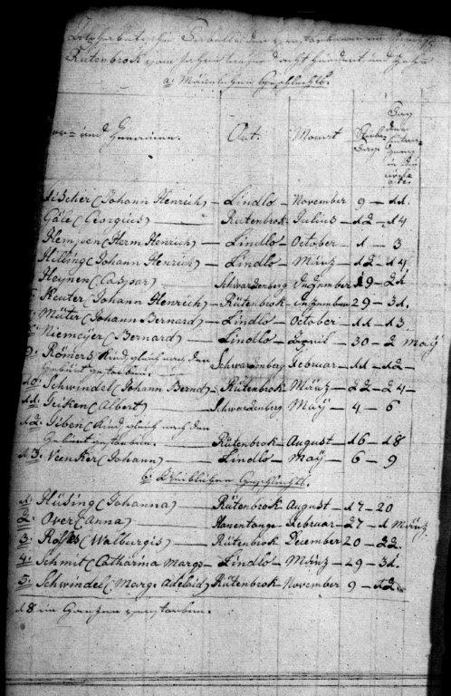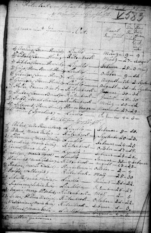 Erstes Blatt Brockhausen Prasident 1. Rütenbrok am 31.01.1810 des vormittags um 11 Uhr. Erklärte vor mir dem untergeschriebenen hiesigen Pfarrer der hiesige Beerbte Neubauer Johan Herm Heller, 35 Jahr alt in Gegenwart zweier Zeugen 1. des hiesigen Küsters, und Schullehres Johann Henrich Keüter, 42 Jahr alt, 2. des hiesigen Beerbten Neubauers Herm Fuhler, 50 Jahr alt, daß ihm von seiner Ehefrau Gertrud geboren Mohs, 28 Jahre alt, gestern als den 30.01 dieses Jahrs des morgens um 6 Uhr ein Knabe geboren sei, welchen er zugleich vorzeigte, und ihm die Namen Johann Albert beilegte. Da der Vater des Kindes, und zweiter Zeuge des Schreibens unkundig, haben der erste Zeuge, und Pfarrer diese sofort darüber aufgenommene Geburtsurkunde, nachdem solche vorgelesen worden, zur obbemerckten Zeit unterschrieben. Jan Herm Keüter, H. Oeldig, als provisorischer Civilstandes-Beamter 2. Rütenbrok am 03.02.1810 des vormittags um 11 Uhr. Erklärte vor mir dem untergeschriebenen hiesigen Pfarrer der hiesige Beerbte Neubauer Lucas Westermann, 38 Jahr alt in Gegenwart zweier Zeugen 1. Seines Vetters des hiesigen Beerbten Neubauers Bernd Schwindel, 25 Jahr alt. 2. Seines Nachbars des Ackersmanns Gerd Schütte, 23 Jahr alt, daß ihm von seiner Ehefrau Tecla geborne Benthem, 39 Jahr alt, ehegestern als am 01.02 dieses Jahrs vormittags um 10 Uhr ein Mädchen geboren sey, welches er zugleich vorzeigte, und ihm die Namen Maria Tecla beilegte. Der Vater des Kindes, Zeugen, und Pfarrer haben diese sofort darüber aufgenommene Geburts Urkunde, nachdem solche vorgelesen worden, zur obbemerckten Zeit unterschrieben. L. Westerman B. Schwindel G. Schütte H. Oeldig, als provisorischer Civilstandes-Beamter. 3. Rütenbrok am 04.02.1810 des Morgens um 9 Uhr. Erklärte vor mir dem untergeschriebenen hiesigen Pfarrer allhier Der Beerbte Neubauer Lucas Gröniger vom Lindlo, 24 Jahr alt in Gegenwart zweier Zeugen. 1. des hiesigen Beerbten Neubauers Herm Fuhler, 50 Jahr alt, 2. des hiesigen Beerbten Neubauers Michael Brummer, ebenfalls 50 Jahr alt, daß ihm von seiner Ehefrau Susanna geboren Heckmann, 25 Jahr alt, vom 31.01 auf den 01.02 des Nachts um 12 Uhr dieses Jahrs ein Mädchen geboren sei, welches er zugleich vorzeigte, und ihm den Namen Maria Agnes beilegte. Da der Vater des Kindes, noch die beiden Zeugen des Schreibens kundig sind, hat er Pfarrer diese sofort darüber aufgenommene Geburts-Urkunde, nachdem solche vorgelesen worden, zur obbemerckten Zeit unterschrieben. H. Oeldig, als provisorischer Civilstandesbeamter. 4. Rütenbrok am 10.02.1810 vormittags um 12 Uhr. Erklärte vor mir dem untergeschriebenen hiesigen Pfarrer der Neubauer Bernd Henrich Alers vom Lindlo, 46 Jahr alt in Gegenwart zweier Zeugen 1. des hiesigen Küsters und Schullehrers Johann Henrich Keuter, 42 Jahr alt. 2. des Schneiders Johann Gerd Hemmen vom Lindlo, 42 Jahr alt, daß ihm von seiner Ehefrau Gertrud geborne Teepen, 44Jahr alt, gestern als am 09.02 dieses Jahrs des Nachts um 3 Uhr ein Mädchen geboren sei, welches er zugleich vorzeigte, und ihm die Namen Phenenna Catharina beilegte. Der Vater des Kindes, Zeugen, und Pfarrer haben diese sofort darüber aufgenommene Geburts-Urkunde, nachdem solche vorgelesen worden, zur obbemerckten Zeit unterschrieben. B. H Ahlerß J. H. Keüter J. G. Hemmen H. Oeldig, als provisorischer Civilstandes-Beamter. 5. Rütenbrok am 25.02.1810 des Morgens um 9 Uhr. Erklärte vor mir dem untergeschriebenen hiesigen Pfarrer der Neubauer vom Lindlo Johann Bernd Ellermann, 26 Jahr alt in Gegenwart zweier Zeugen 1. seines Schwagers Dirk Griep vom Lindlo, 39 Jahr alt. 2. des hiesigen Küsters, und Schullehrers Johann Henrich Keuter, 42 Jahr alt, daß ihm von seiner Ehefrau Anna Adeleidis Ellermann geborne Dulle, 24 Jahr alt, gestern als am 24.02 des Morgens um 4 Uhr ein Mädchen geboren sei, welches er zugleich vorzeigte, und ihm die Namen Margaretha Adeleid beilegte. Der Vater des Kindes, Zeugen und Pfarrer haben diese sofort darüber aufgenommene Geburts-Urkunde, nachdem solche vorgelesen worden, zur obbemerkten Zeit unterschrieben. J.B. Ellerman D. Grip J.H. Keüter H. Oeldiges, als provisorischer Civilstandes-Beamter 6. Rütenbrok am 26.02.1810 des Mittags um 12 Uhr. Erklärte vor mir dem untergeschriebenen hiesigen Pfarrer der Neubauer vom Lindlo Gerd Herm Gerdes, 35 Jahr alt in Gegenwart zweier Zeugen 1. Seines Schwagers des Ackerbaus-Gehülfen Benedict Hempen vom Lindlo, 22 Jahr alt. 2. Seines Nachberns des Neubauers Dirk Schmit, 44 Jahr alt, daß ihm von seiner Ehefrau Elisabeth Gerdes geborene Hempen, 25 Jahr alt, ___ 02.02 dieses Jahres des Morgens um 5 Uhr ein Mädchen geboren sei, welches er zugleich vorzeigte, und ihm die Namen Anna Tecla beilegte. Der Vater des Kindes, Zeugen, und Pfarrer haben diese sofort darüber aufgenommene Geburts-Urkunde, nachdem solche vorgelesen worden, zur obbemerkten Zeit unterschrieben. G. H. Gerdes B. Hempen J. D. Schmits H. Oeldig, als provisorischer Civilstandes-Beamter 7. Rütenbrok am 01-03.1810 vormittags um 11 Uhr. Erklärte vor mir dem untergeschriebenen hiesigen Pfarrer der hiesige Neubauer Johann Herm Eikes, 29 Jahr alt in Gegenwart zweier Zeugen. 1. Seines Bruders des Beerbten Herm Eike Eikes aus Niederlangen Kirchspiels Lathen, 40 Jahr. 2. des hiesigen Küsters und Schullehrers Johann Henrich Keüter, 42 Jahr alt, daß ihm von seiner Ehefrau Engel geborne Nuttmann, 25 Jahr alt, ehegestern als am 27.02 dieses Jahrs Nachmittags um 2 Uhr ein Knabe geboren sei, welchen er zugleich vorzeigte, und ihm die Namen Johann Herm beilegte. Der Vater des Kindes, Zeugen, und Pfarrer haben diese sofort darüber aufgenommene Geburts-Urkunde, nachdem solche vorgelesen worden, zur obbemerckten Zeit unterschrieben. H. Eikens H E. Eikens J. H. Keüter H. Oeldiges, als provisorischer Civilstandes-Beamter 8. Rütenbrok am 03.03.1810 vormittags um 10 Uhr. Erklärte vor mir dem untergeschriebenen hiesigen Pfarrer der Neubauer vom Lindlo Gerd Fischer, 37 Jahr alt in Gegenwart zweier Zeuge