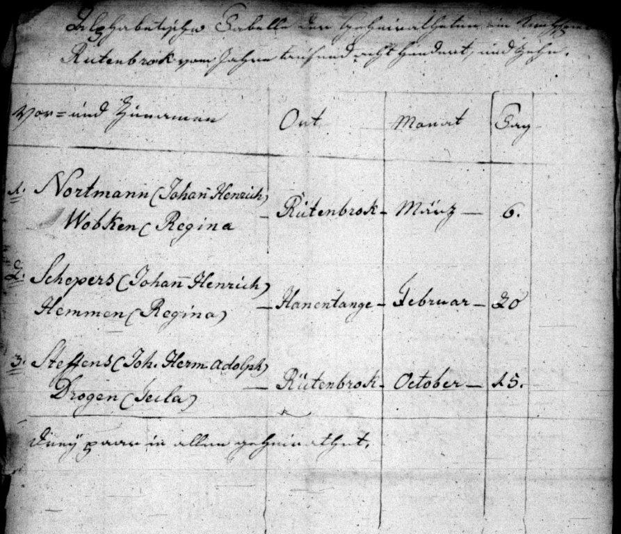 Erstes Blatt Brockhausen Prasident In der Pfarrkirche zu Rütenbrok am 20.02.1810 vormittags um 10 Uhr. Ward der in Kleinen Hesepe Kirchspiels Hesepe geborne 32 Jahre, 8 Monate, und 28 Tage alte, also in Hinsicht auf eheliche Verbindung volljährige Junggeselle Johann Henrich Schepers, Ackerbaus-Gehülfe zu Kleinen Hesepe, des dortigen verstorbenen Brinksitzers Gerhard Henrich Schepers, und dessen Ehefrau Phenenna maria Schepers geborne Stubben drittgeborner ehelicher Sohn, mit seiner verlobten Braut Jungfer Regina Hemmen des verstorbenen Neubauers Lambert Hemmen auf der Hanentange Kirchspiels Rütenbrok, und dessen Ehefrau Walburgis hemmen geborne Husen älteste heute 24 Jahre weniger 7 Tage alte, mithin gleichfalls volljährige Tochter, nachdem 1. Beide verlobten an den beiden Sonntagen Dom IV & V post Epiph. als am 28.01 und 04.02 dieses Jahres zu Hesepe, und Dom. V & VI als am 04 und 11.02 dahier zweimal in der Pfarrkirche unmittelbar nach Beendigung des vormittagigen Pfarr-Gottesdienstes als ehelich verlobte aufgeboten, auch ihre vorhabende Ehe durch öffentlichen Anschalg allhier und zu Hesepe weiter bekannt gemacht worden und nirgend Einspruch geschehen war. 2. nachdem der Bräutigam, und die Braut, beide die erforderlichen beglaubigten Sterbe-Scheine ihres beiderseits verstorbenen Vaters eingereicht, deren Mütter aber beide ihre Einwilligung bei dem gegenwärtigen Trau-Acte persönlich, und öffentlich eingestanden hatte. 3. Nachdem beide Verlobten und sämtliche übrigen Comparenten alle über die jetz zu schließende Heürath bereits ergangenen, und verhandelten Acten vorgelesen, und von ihnen paraphiert worden; nämlich die Geburtsscheine der beiden Verlobten, die Sterbescheine ihres beiderseits verstorbenen Vaters, endlich auch die Scheine über die zu Hesepe, und dahier, auch an beiden Orten ohne Einspruch stattgefundenen ehelichen Aufgebote, und nachdem zuletzt auch das 6. Kapitel des Titels von der Ehe aus dem Gesetzbuche Napoleon öffentlich vorgelesen, nachdem beide Verlobte, und jeder besonders also: 1. Ackerbaus-Gehülfe Johann Henrich Schepers als Bräutigam. 2. Die Jungfrau Regina Hemmen als Braut nach Befragen laut, und öffentlich erklärt haben, daß sie sich zur Ehe einander begehrten, und daß sie soviel die Wirkungen ihrer ehelichen Verbindung in Beziehung auf ihr gegenseitiges Vermögen betrifft, auf ihren in gesetzlicher Form abgeschlossene Heürathscontract sich bezögen, von untergeschriebenen hiesigen Pfarrer in der hiesigen Pfarrkirche öffentlich, und im Namen des Gesetzes ehelich getraut, und ist sofort darüber diese Urkunde aufgenommen worden. Die von den neuen Eheleuten selbst erwählten, und außer der beiderseitigen Mütter, bei dem ganzen Trau-Acte zugegen gewesenen Zeugen waren. 1. Der Brinksitzer Gerd Bernd Schepers aus großen Hesepe, 35 Jahr alt, Bruder des Bräutigams 2. Der Neubauer im Twiste Herm Hinrich Schepers, 28 Jahre alt, ebenfalls Bruder des Bräutigams. 3. Der Neubauer von der Hanentange Lübbert Evens, 35 Jahr alt, seiner Erklärung nach keinen von beiden Theilen verwandt. 4. Der hiesige Küster, und Schullehrer Johann Henrich Keuter, 42 Jahr alt, keinen von beiden Theilen verwandt. Nachdem nun vorstehende Heüraths-Urkunde sowohl den Kontrahenten, als auch den übrigen Interessenten, und Zeugen vorgelesen worden, haben die beiden letzten Zeugen, da die übrigen des Schreibens unkundig sind, solche nebst dem unterzeichneten hiesigen Pfarrer zur obbemerkten Zeit unterschrieben. J. L. Evers J. H. Keüter H. Oeldig, als provisorischer Cvilstandsbeamter. Rütenbrok in der Pfarrkirche am 06.03.1810 vormittags um 9 Uhr. Ward der in Werlte geborne 32 Jahre, 1 Monat und 6 Tage alte, also in Hinsicht auf eheliche Verbindung volljährige Junggeselle, und Schuster Johann Henrich Nortmann aus Werlte, des dasigen Brinksitzers Bollwin Nortmann, und dessen Ehefrau Helena Nortmann geborne Stindt ehelicher einziger Sohn, mit seiner verlobten Braut Frau Regina Husing, des verstorbenen Hauslers? Detert Husing, aus Niederlangen Kirchspiels Lathen, und dessen Ehefrau Johanna Hüsing geborne Gerdes eheliche jüngste Tochter, Wittfrau des verstorbenen hiesigen Neubauers Bernd Wobken, heute 40 Jahre, 9 Monate, 27 Tage alt, mithin gleichfalls volljährig; nachdem 1. beide Verlobte an den beiden Sonntagen als den 11 und 18.02 dieses Jahrs dahier sowohl als zu Werlte zweimal in der Pfarrkirche unmittelbar nach Beendigung des vormittagigen Pfarr-Gottes-Dienstes als ehelich verlobte aufgeboten, auch ihre vorhabende Ehe durch öffentlichen Anschlag allhier und zu Werlte weiter bekannt gemacht wurde, und nirgend Einspruch geschehen war. 2. Nachdem der Bräutigam die Einwilligungsurkunde seiner Eltern in authentischer Form datiert Werlte am 28.02.1810 vormittags um 10 Uhr eingereicht hatte; die Braut aber den erforderlichen beglaubigten Sterbe-Schein ihres zu Niederlangen Kirchspiels Lathen verstorbenen Vaters, sodann in Hinsicht ihrer Mutter die Einwilligungs-Urkunde in authentischer Form datiert Rütenbrok am 27.02.1810 vormittags um 11 Uhr eingereicht hatte. 3. Nachdem beiden Verlobten, und sämtlichen überigen Comparenten alle über die jetz zu schließende Heürath bereits ergangenen, und verhandelten Acten vorgelesen worden, und von ihnen paraphiert worden, nämlich die Geburts-Scheine der beiden Verlobten, die Einwilligungs-Urkunde der Eltern des Bräutigams, den Sterbe-Schein des Vaters der Braut, die Einwilligungs-Urkunde ihrer Mutter, den Sterbeschein ihres ersten Mannes; endlich auch die Scheine über die zu Werlte, und dahier, auch an beiden Orten ohne Einspruch stattgefundenen ehelichen Aufgebote, und nachdem zuletzt auch das 6. Capittel des Titels von der Ehe aus dem Gesetzbuche Napoleon öffentlich vorgelesen, nachdem beiden Verlobten, und jeder besonders also: 1. Der Junggeselle, und Schuster Johann Henrich Nortmann als Bräutigam. 2. Die Wittwe Regina Wobken geborne Hüsing als Braut. Auf Befragen laut, und öffentlich erklärt haben, daß sie 