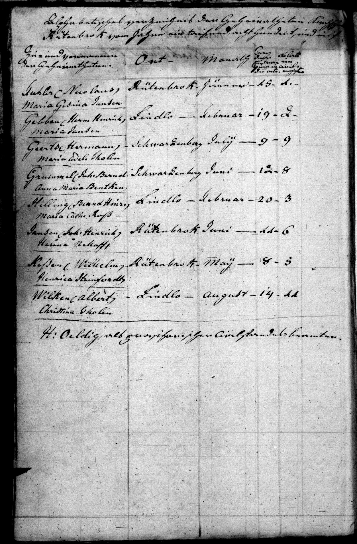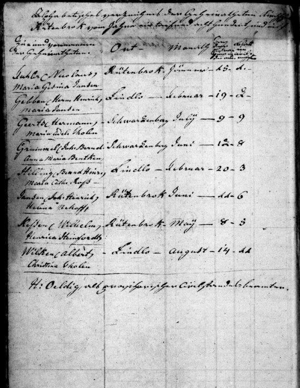 Erstes Blatt Brockhausen Prasident 1. In der Pfarrkirche zu Rütenbrock am 15.01.1811 vormittags um 9 Uhr. Ward der in Dersum Kirchspiels Steinbild geborne, 27 Jahre, 1 Monat und 10 Tage, also in Hinsicht auf eheliche Verbindung volljährige Junggeselle, und Ackerbausgehülfe Claes Fuhler, dahier des hiesigen Neubauers Herm Fuhler und dessen Ehefrau Tobe Fuhler geborne Beller ältester ehelicher Sohn mit seiner verlobten Braut Wittwe Maria Gesina Schwindel dahier, des verstorbenen hiesigen Neubauers Joann Jansen, und dessen verstorbenen Ehefrau Catharina Margaretha Jansen geborne Westermann, älteste heute 25 Jahre weniger 8 Tage alte, mithin gleichfalls volljährige Tochter, nachdem 1. beide Verlobten an den beiden Sonntagen als am 30.12 vorigen Jahres, und am 06.01 dieses Jahrs dahier zweimal in der Pfarrkirche unmittelbar nach Beendigung des vormittägigen Pfarr-Gottesdienstes als ehelich verlobte aufgeboten, auch ihre vorhabende durch öffentlichen Anschlag weiter allhier bekannt gemacht worden, und kein Einspruch geschehen war. 2. nachdem die Eltern des Bräutigams ihre beiderseitige Einwilligung bei dem gegenwärtigen Trauacte persönlich, öffentlich und feierlich eingestanden hatten, die Braut aber die Todten-Schein ihrer Eltern, dahier auch die Dispense in dem auch dem Gesetze erforderlichen zehnmonatlichen Wittwen-Stande eingereicht hatte. 3. Nachdem beiden Verlobten, und sämtlichen übrigen Comparenten alle die über die jetz zu schließende Heirath bereits ergangenen, und verhandelten Acten vorgelesen, und von ihnen paraphirt worden; nämlich die Geburts-Scheine der beiden Verlobten, die Sterbe-Scheine der Eltern der Braut, die Dispense in dem nach dem Gesetze erforderlichem zehnmonatlichen Wittwen-Stande, die Todten-Scheine ihrer beiden ersten Männer, endlich auch die Scheine über die dahier ohne Einspruch stattgefundenen ehelichen Aufgebote, und nachdem auch zuletzt auch das 6. Capittel des Titels von der Ehe aus dem Gesetzbuche Napoleon öffentlich vorgelesen, nachdem beiden Verlobten, und jeder besonders also: 1. der Ackerbaus-Gehülfe Claes Fuhler als Bräutigam. 2. die Wittwe Maria Gesina Schwindel als Braut. Auf Befragen laut, und öffentlich aussagten, daß sie sich zur Ehe einander begehrten, und daß sie soviel die Wirkungen ihrer ehelichen Verbindung in Beziehung auf ihr gegenseitiges Vermögen betrifft, auf ihren in gesetzlicher Form abgeschlossenen Heirathscontract sich bezögen, von unterschriebenen hiesigen Pfarrer in der hiesigen Pfarrkirche öffentlich und im Namen des Gesetzes ehelich getraut, und ist darüber sofort diese Urkunde aufgenommen worden. Die von den neuen Eheleuten selbst erwählten, und außer den Eltern des Bräutigams bei dem ganzen Trauacte zugegen gewesenen Zeugen waren: 1. der Beerbte Johann Henrich Oeldig zur Bregenborg im Kirchspiel Meppen, 54 Jahre alt, keinen von beiden Theilen verwandt. 2. der hiesige Küster und Schullehrer Johann Henrich Keüter, 42 Jahre alt, auch keinem verwandt. 3. der Ackersmann Herm Henrich Meiners aus Varlo Kirchspiels Meppen, 43 Jahre alt, nicht verwandt. 4. der Heuermann vom Hebel Kirchspiels Wesuwe Anton Korte, 53 Jahre alt, auch nicht verwandt. Nachdem nun vorstehende Heiraths-Urkunde sowohl den Kontrahenten, als auch Gezeügen vorgelesen worden, haben sie solche außer Braut, und Bräutigam, und die Eltern des Bräutigams, die Schreibens unkundig sind :/sämtlich nebst dem unterzeichneten hiesigen Pfarrer zur obbemerkten Zeit unterschrieben: J. H. Keüter H. Oeldig H. H. Meiners A. Korte H. Oeldig, als provisorischer Civilstandes-Beamter 2. Rütenbrock in der Pfarrkirche am 19.02.1811 vormittags um 10 Uhr. Ward der in Hüntel im Kirchspiel Wesuwe geborne 32 Jahre, 4 Monate und 8 Tage alte, also in Hinsicht auf eheliche Verbindung volljährige Junggeselle, und Ackersmann Herm Henrich Gebben aus Hüntel, des dasigen verstorbenen Brinksitzers Gerd Gebben, und dessen Ehefrau Tecla Gebben geborne Eilers ehelicher einziger Sohn mit seiner verlobten Braut Frau Maria Jansen, des in der Horst Kirchspiels Lathen verstorbenen Beerbten Lucas Jansen, und dessen Ehefrau Gesina Jansen geborne Langen älteste heute 45 Jahre, 7 Monate und 4 Tage alte, mithin gleichfalls volljährige Tochter Wittwe des aufm Lindlo verstorbenen Neubauers Bernd Niemeyer, nachdem 1. beide Verlobten an den beiden Sonntagen als am 20, und 27.01 dieses Jahrs dahier sowohl als zu Wesuwe zweimal in der Pfarrkirche unmittelbar nach Beendigung des vormittägigen Pfarr-Gottes-Dienstes als ehelich verlobte aufgeboten, auch ihre vorhabende ehe durch öffentlichen Anschlag dahier sowohl als zu Wesuwe weiter bekannt gemacht worden, und nirgend Einspruch geschehen war. 2. Nachdem Bräutigam sowohl als Braut den erforderlichen beglaubigten Sterbeschein ihres beiderseits verstorbenen Vaters, sodann in Hinsicht ihrer beiderseitigen Mütter die Einwilligungs-Urkunden in authentischer Form eingereicht hatten, erste datiert Rütenbrok am 16.01.1811 vorittags um 11 Uhr, 2te datirt Rütenbrok am 14.01.1811 vormittags um 11 Uhr. 3. Nachdem beiden Verlobten, und sämtlichen übrigen Comparenten alle die über die jetz zu schließende Heirath bereits ergangenen, und verhandelten Acten vorgelesen, und von ihnen paraphirt worden; nämlich die Geburtscheine der beiden Verlobten, der Sterbeschein des beiderseitigen Vaters so, wie die Einwilligungs-Urkunden ihrer beiderseitigen Mütter, endlich auch die Scheine über die zu Wesuwe, und dahier auch an beiden Orten ohne Einspruch stattgefundenen ehelichen Aufgebote, und nachdem zuletz[t] auch das 6. Capittel des Titels von der Ehe aus dem Gesetzbuche Napoleon öffentlich vorgelesen, nachdem beide Verlobten, und jeder besonders also: 1. der Junggeselle,u nd Ackersmann Herm Henrich Gebben als Bräutigam. 2. die Wittwe Maria Niemeyer geborne Jansen als Braut. Auf Befragen laut, und öffentlich erklärt haben, daß sie sich zur Ehe einander begehrten, und daß sie soviel die Wirkungen ihrer ehelichen Verbindung in Beziehung